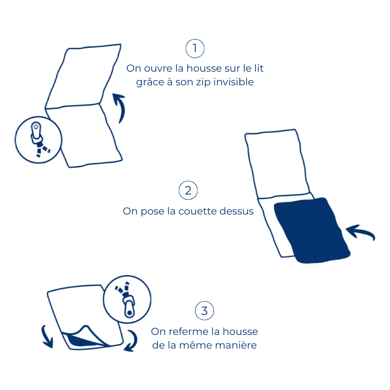 Toutes nos housses de couette intègrent le système Marmot'Zzz : il suffit d'ouvrir la housse sur 3 côtés grâce à son zip invisible puis d'y poser la couette et de refermer.